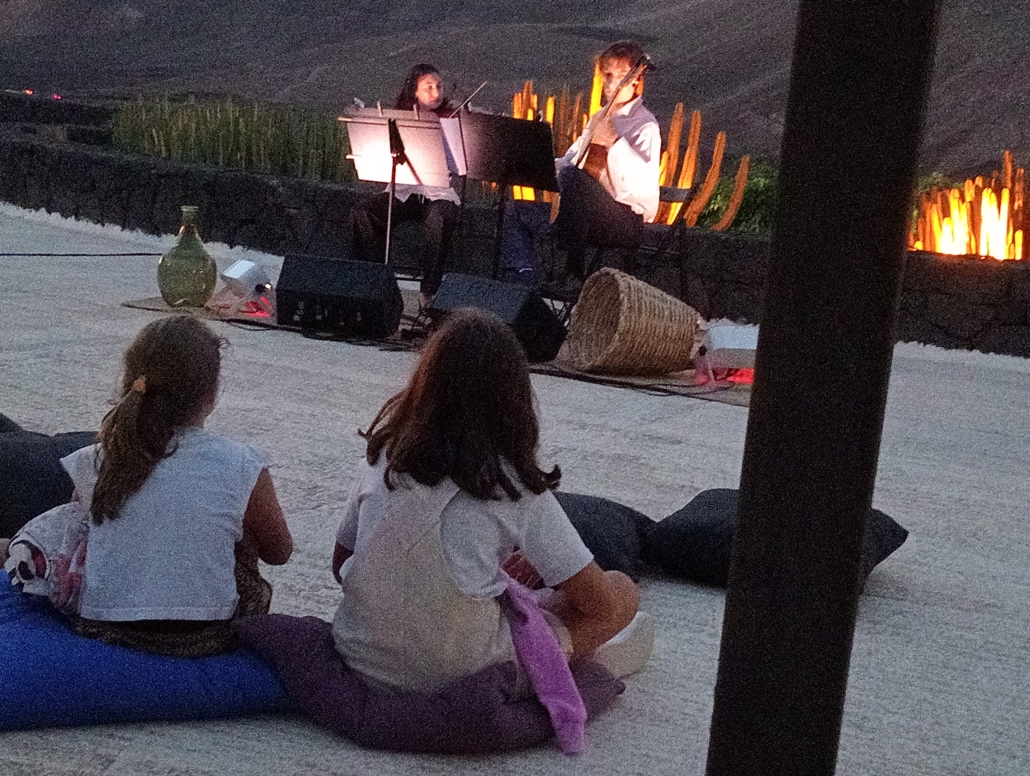 Nothing could have more clearly epitomised the aims of Rofe Producciones than tonight´s event. Yaiza Council staff had strewn plump, luxurious cushions on the hard concrete floor of the children´s playground in Femes and had laid out rows of seats in front of the ´stage´ where two seats, for the female violinist and the male guitarist were set. All this was in front of a small, cultivated cactus garden which had been lit tonight to highlight and dramatise the tall ´blue candle´ cacti variants standing behind the musicians.