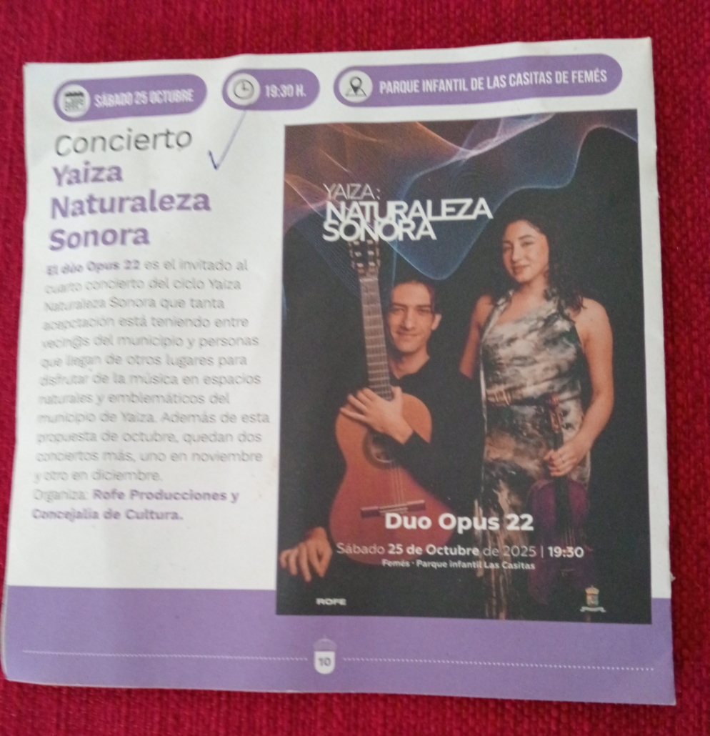 The duo Opus 22 were the guests of honour at the fourth concert in the Yaiza Naturaleza Sonora series, which has been so popular among residents of the municipality and those who come from other places to enjoy the music in the natural and emblematic spaces of the municipality of Yaiza. In addition to this October concert, there are two more concerts to follow, one in November and one in December, organized by Rofe Producciones and the Department of Culture