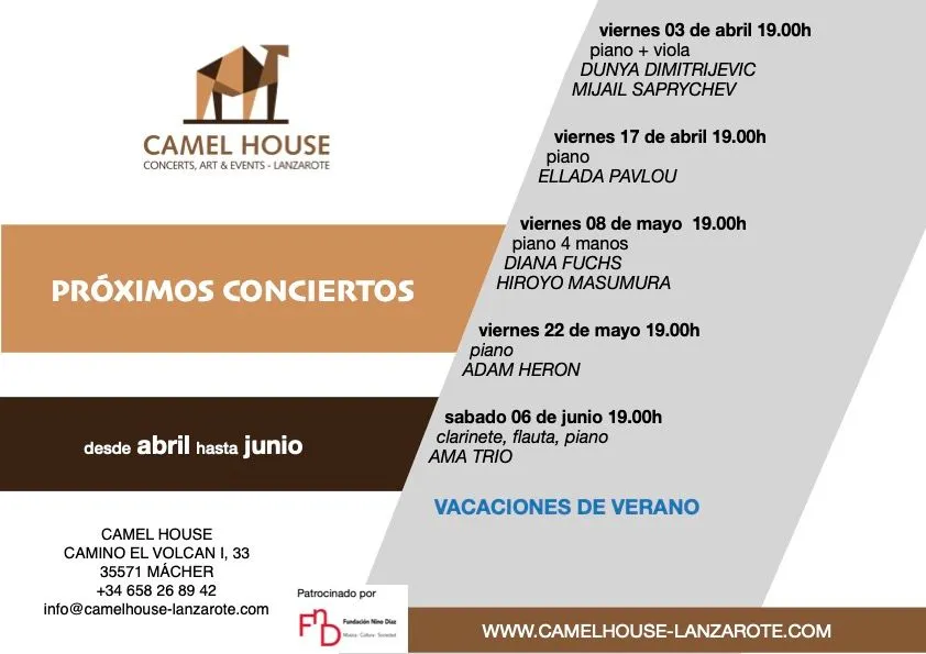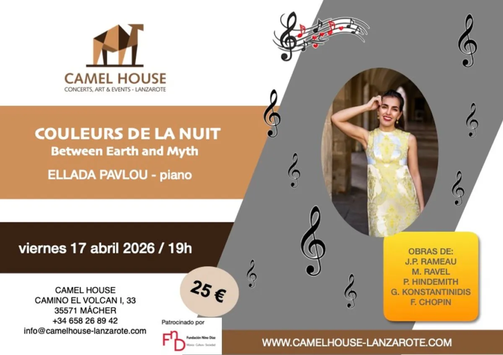 Now, on 17 April, 2026, The Camel House, a unique and beautifully situated classical music venue on Lanzarote will welcome the wonderful pianist, Eladda Pavlou, (left) from Vienna. She will enchant us with COULEURS DE LA NUIT (between Earth and Myth) ,music ranging from the Baroque era to the modern day.